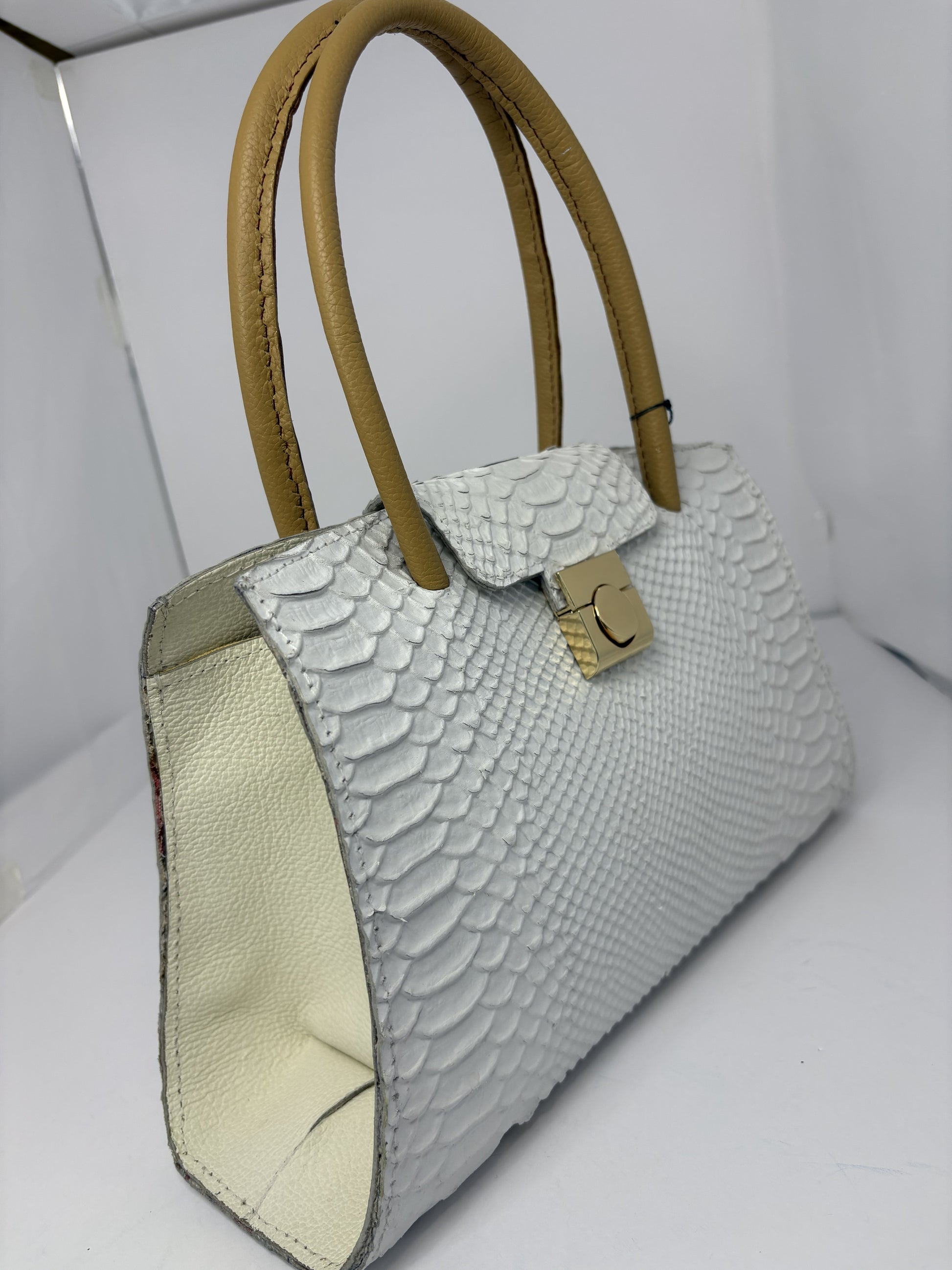 The Brittney is a study in quiet confidence—designed for moments when presence speaks louder than words. Its structured silhouette is crafted in a softly textured white leather with a delicate, alligator-inspired finish, creating depth without excess. The tone is serene and luminous, evoking clarity, calm, and timeless grace.