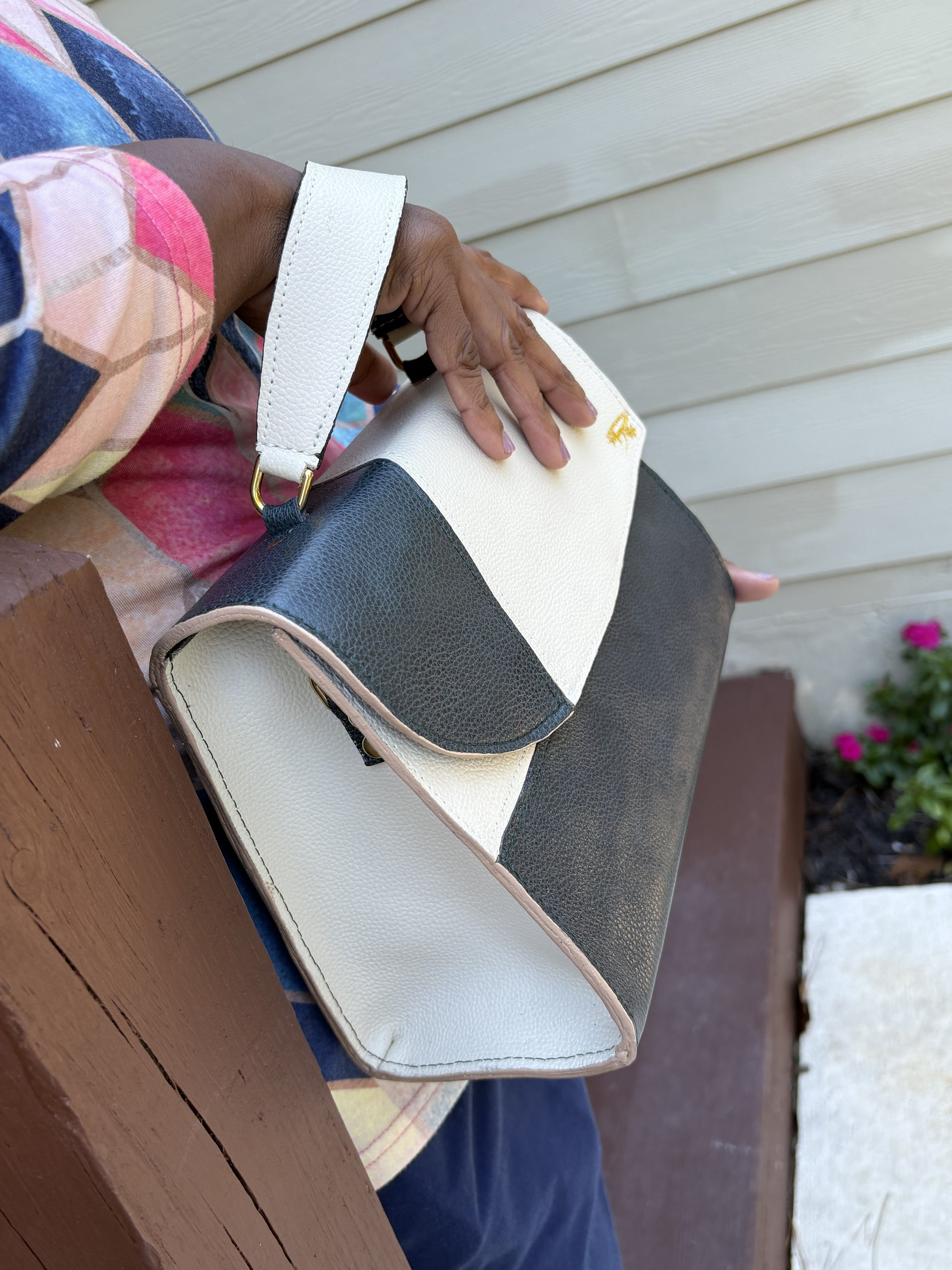 The Michele Handbag blends luxury and practicality with its exquisite leather exterior and interior, crafted in elegant white and deep green hues. Featuring a refined marquetry design, this bag offers versatile carrying options through its top handle and shoulder strap. Inside, an open pocket and a zippered compartment keep essentials organized, while the magnetic closure ensures secure access. Perfectly balancing style and function, the Michele Handbag elevates any ensemble with sophisticated charm. Handbag size: 7" H x 10" W x 4" D, with top handle 11" H